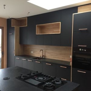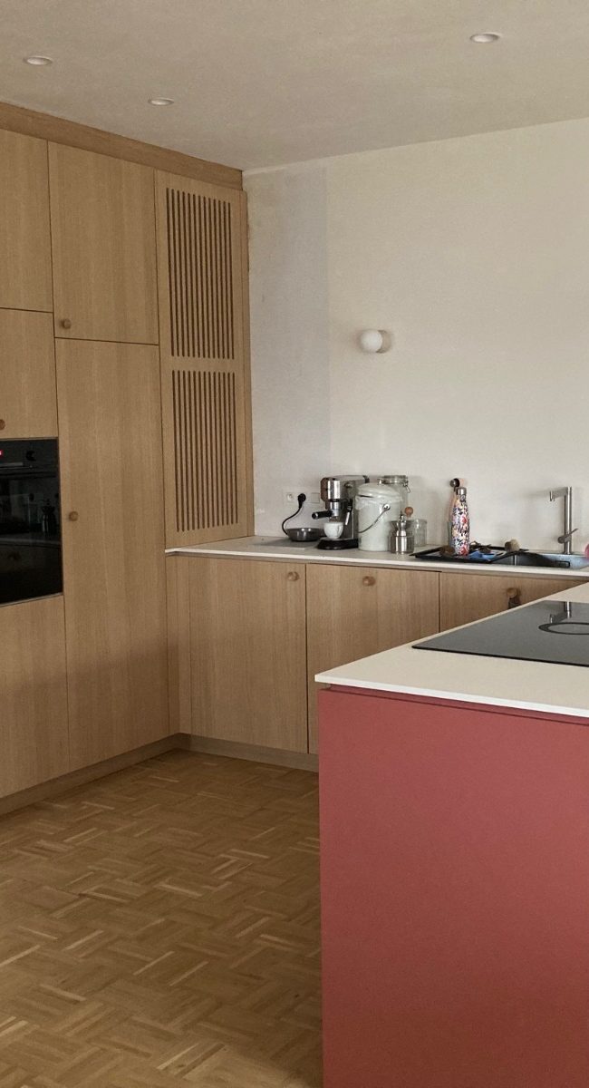 Le chêne et le rose terracotta se répondent avec douceur.L’îlot fait le lien entre la cuisine et la salle à manger : on cuisine, on discute, on profite.Un aménagement simple et chaleureux, pensé pour vivre ensemble. Article précédent← Une cuisine qui suit le mouvement Une cuisine qui suit le mouvement Article suivantQuand le noir rencontre le bois → Quand le noir rencontre le bois